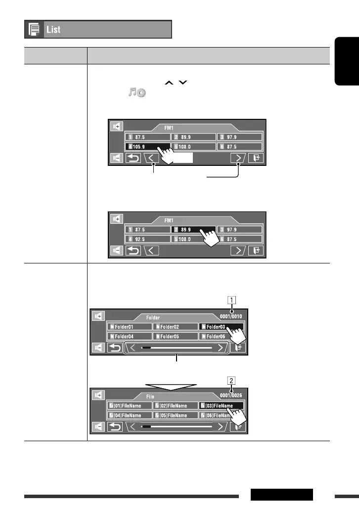 If a disc/device includes folders, you can display the Folder/Track (File) Lists, then start