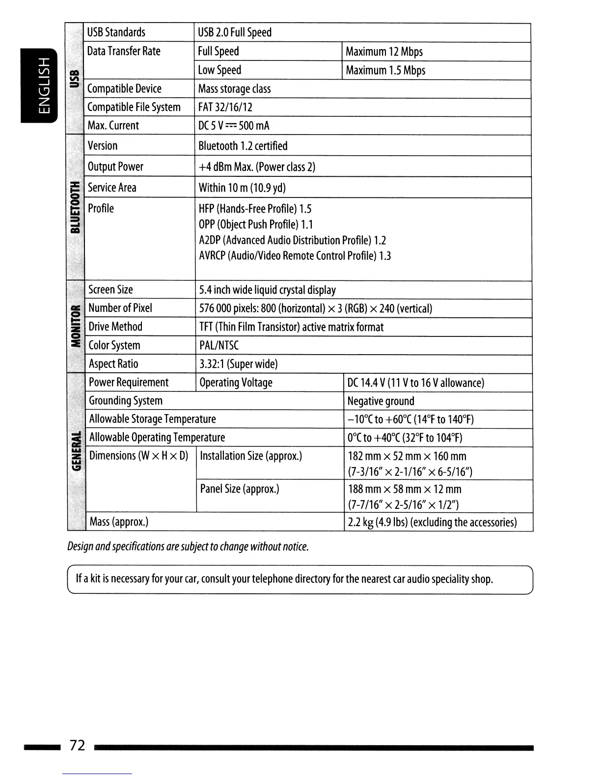 JVC KD-AVX77 - USB, Bluetooth, and General Specifications; USB and Bluetooth Technical Details; Monitor and General Unit Specifications