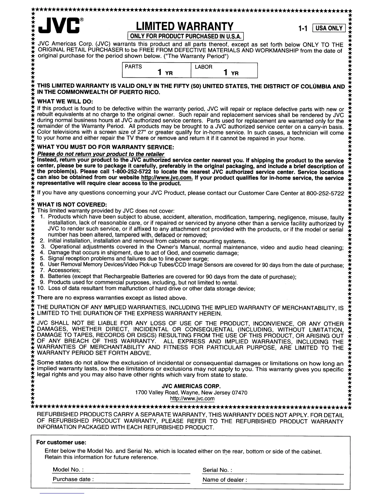 during normal business hours at JVC authorized service centers. Parts used for replacement are warranted only for the