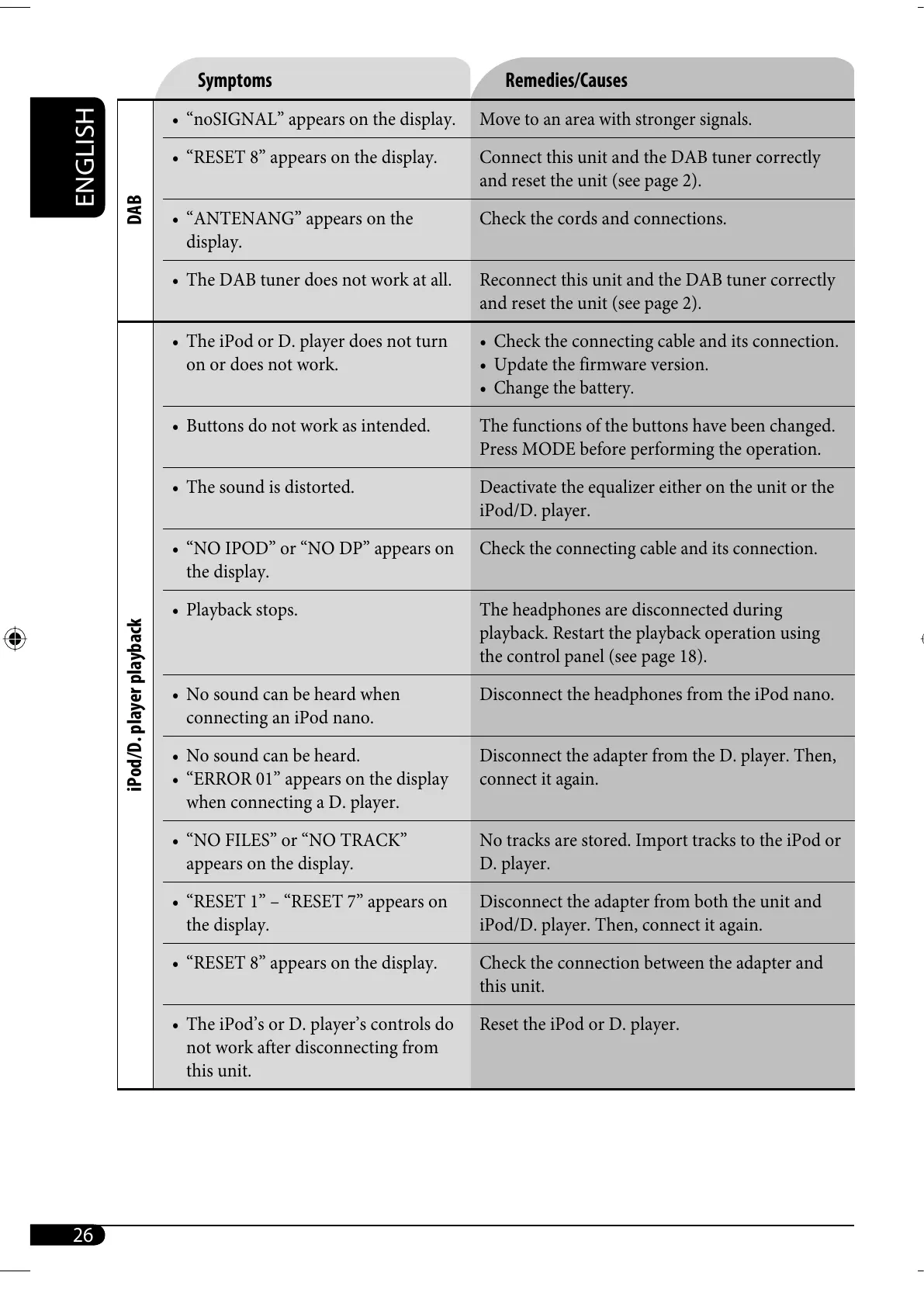 • The DAB tuner does not work at all. Reconnect this unit and the DAB tuner correctly