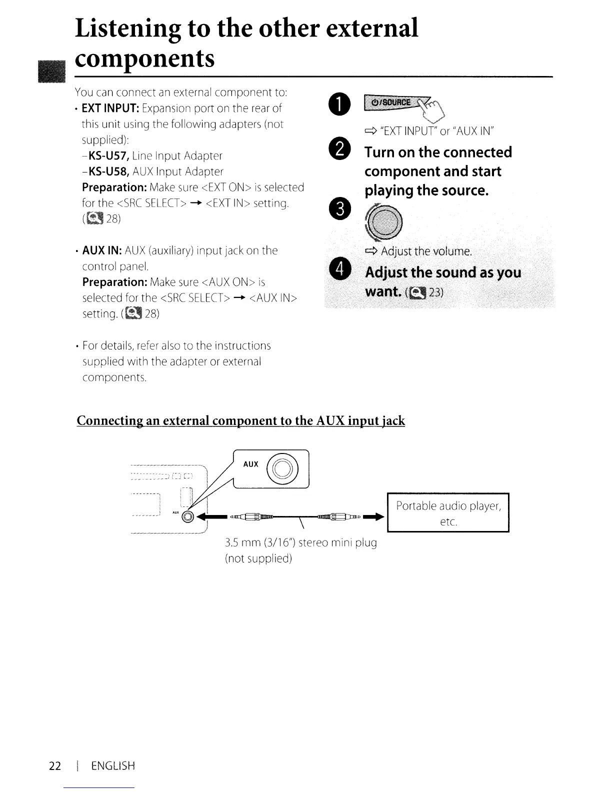 Connecting an external component to the AUX input jack