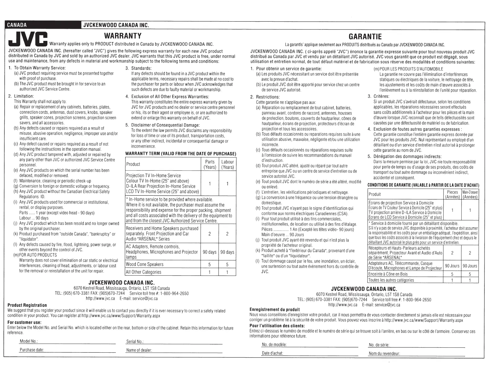 JVC KD-RD88BT - WARRANTY (CANADA); Canadian Warranty Terms