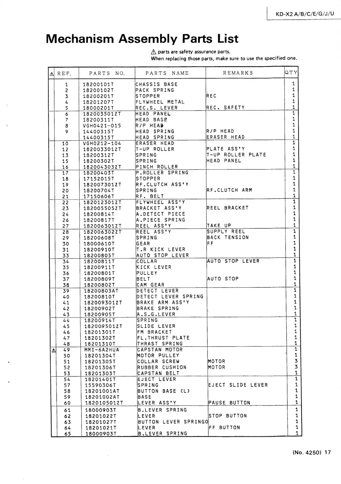 JVC KD-X2 - Mechanism Assembly Parts List