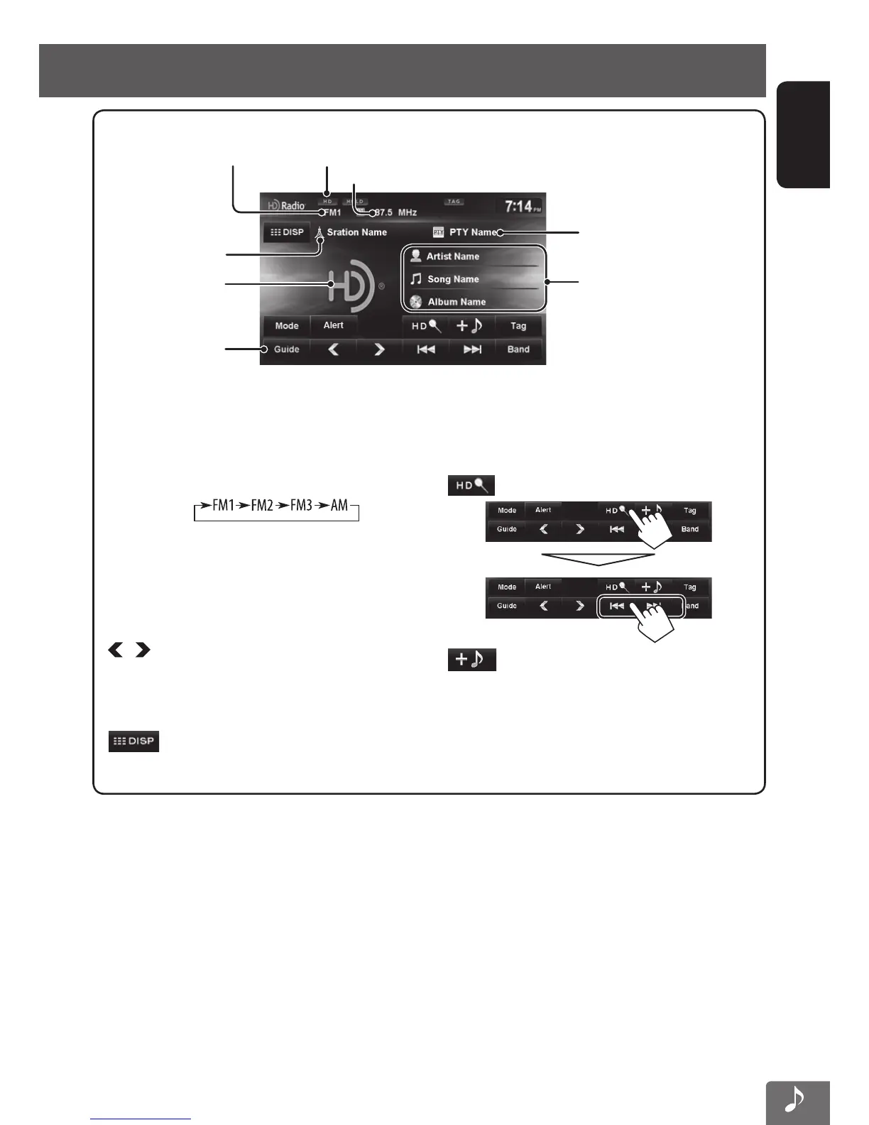 • HD: Lights when receiving an HD Radio broadcast