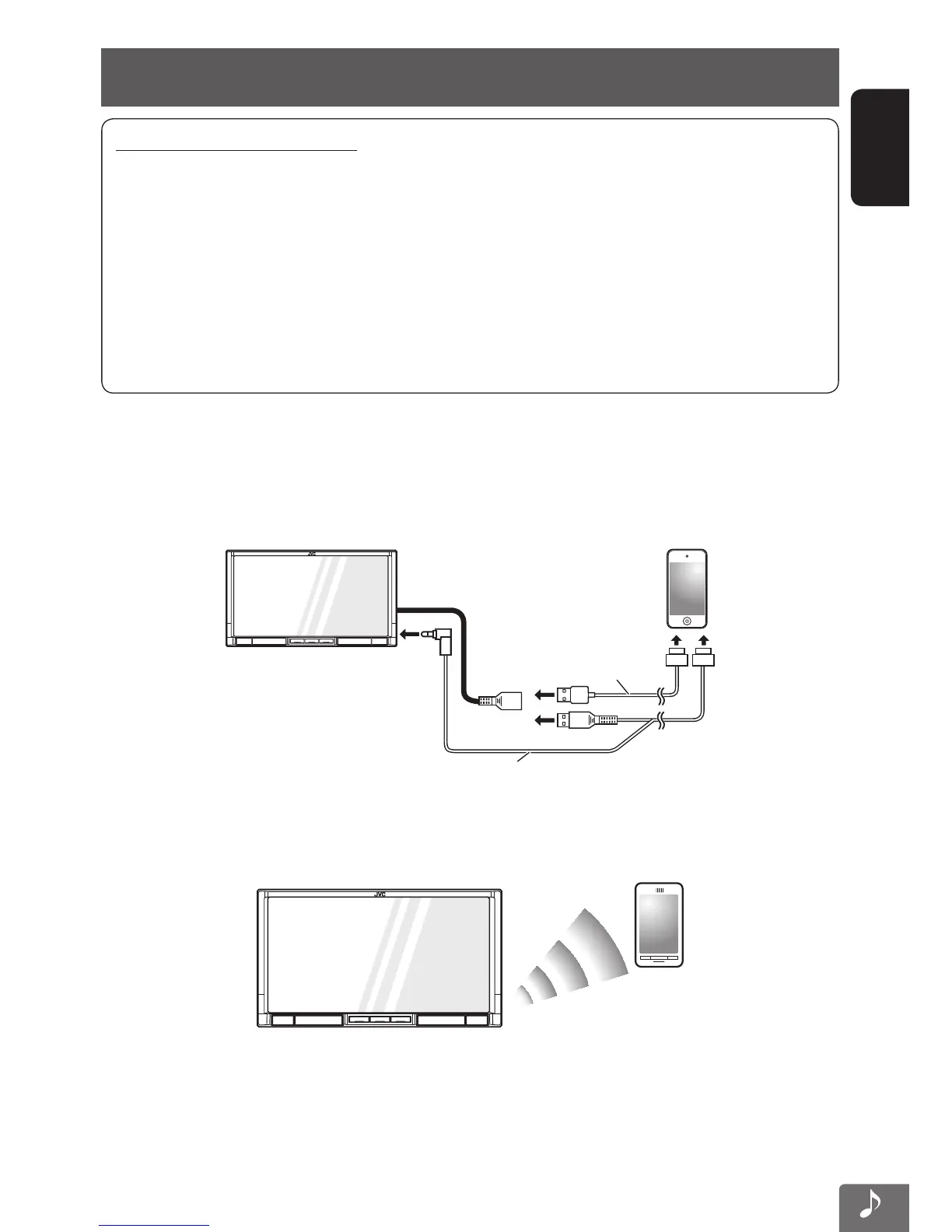 For connection, use a USB2.0 cable (accessory of the iPod/iPhone) or a USB Audio and Video cable for iPod/