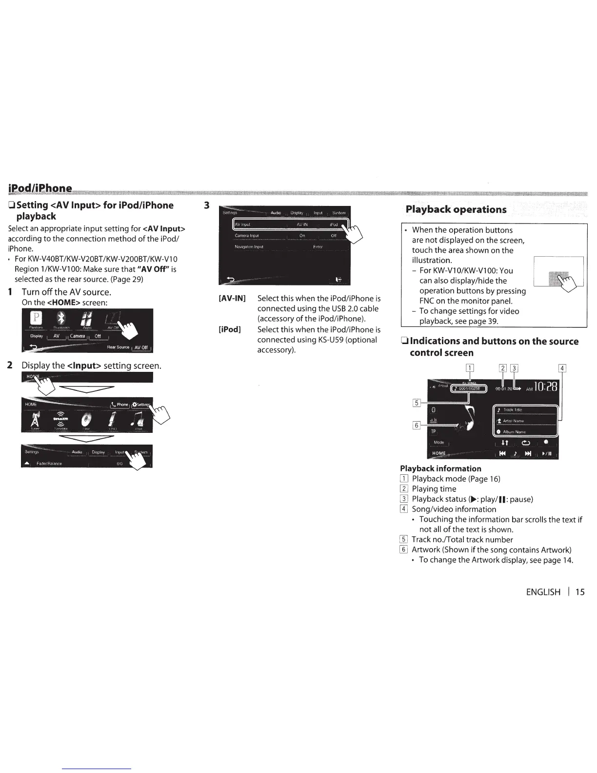 JVC KW-V200BT - Setting AV Input for Ipod;Iphone Playback; Playback Operations; Indications;Buttons on Source Control Screen