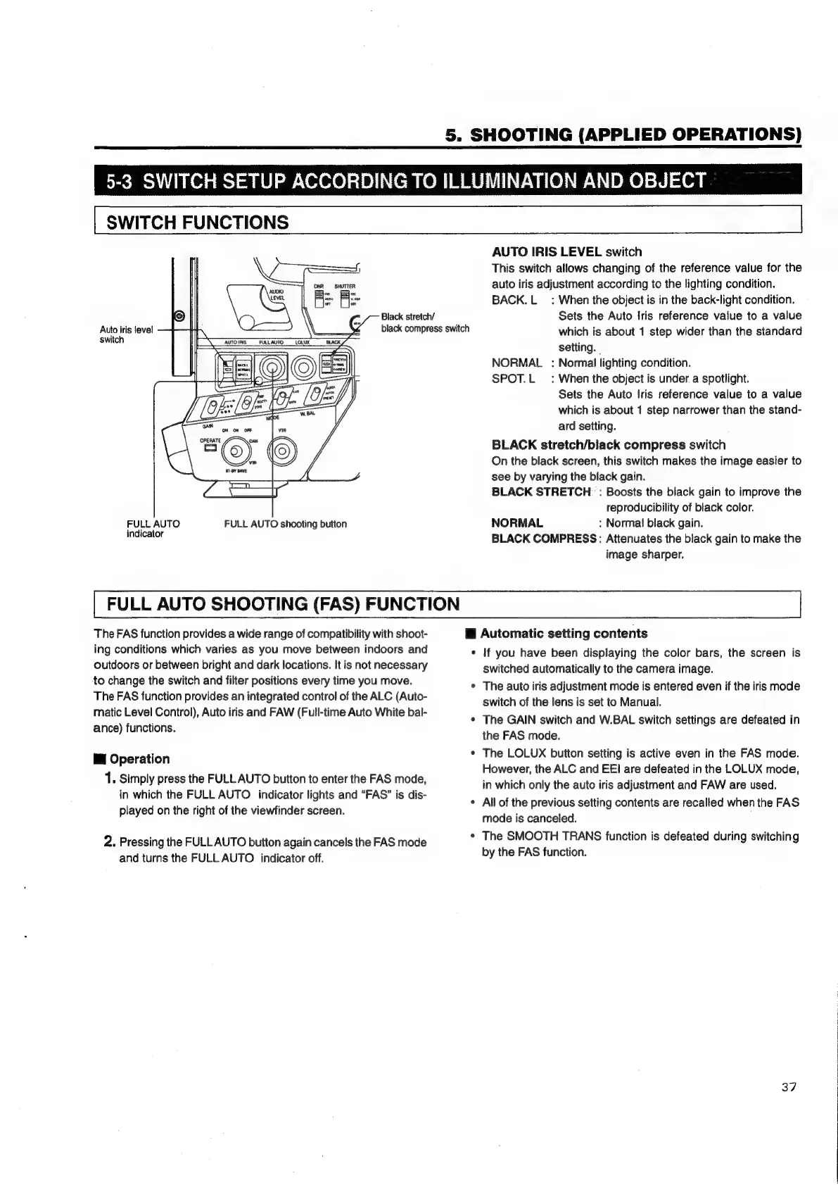 JVC KY-D29 - Switch Setup According to Illumination and Object; Switch FUNCTIONS; Ees Ceteeeeseserenectensescstsaseaesoessnesesseanscees; Full Auto Shooting (FAS) Function