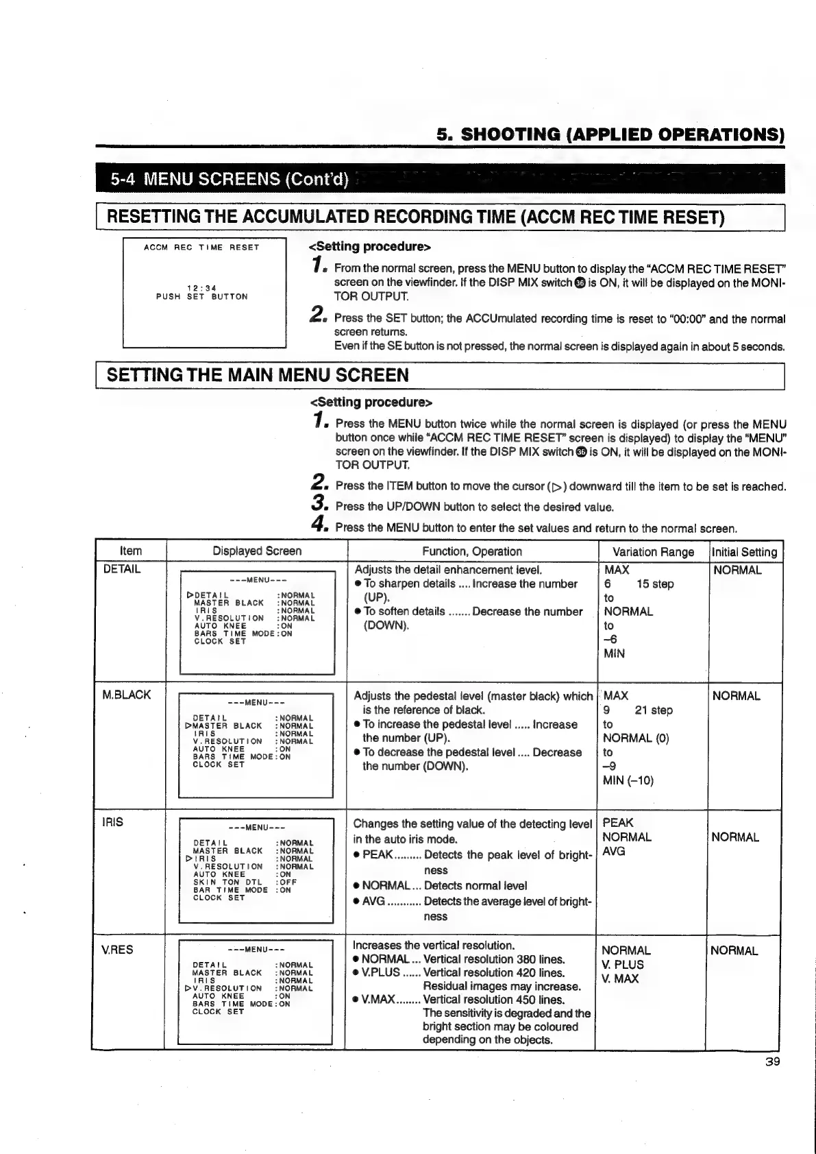 JVC KY-D29 - Resetting the Accumulated Recording Time; Setting the Main Menu Screen