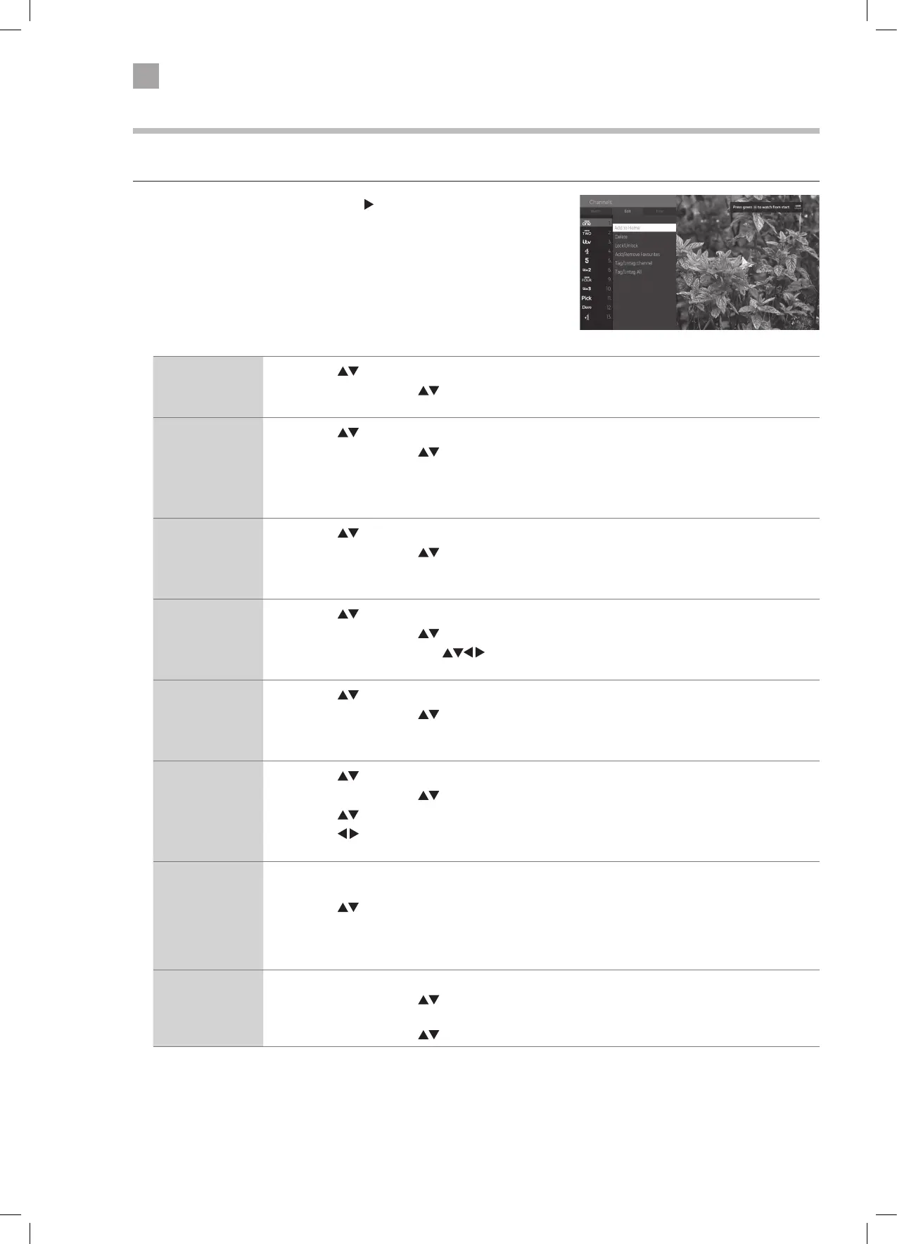 You can add channels to your home menu, delete, lock, add favourites, or tag channels in the EDIT CHANNEL LIST menu.