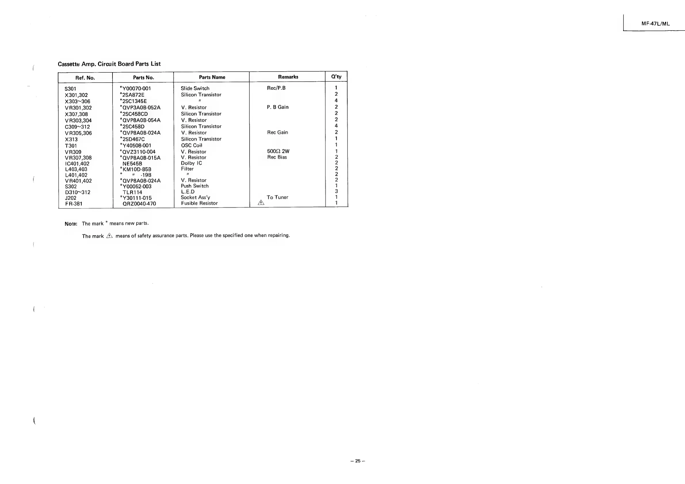 JVC MF-47L - Cassette Amp. Circuit Board Parts List