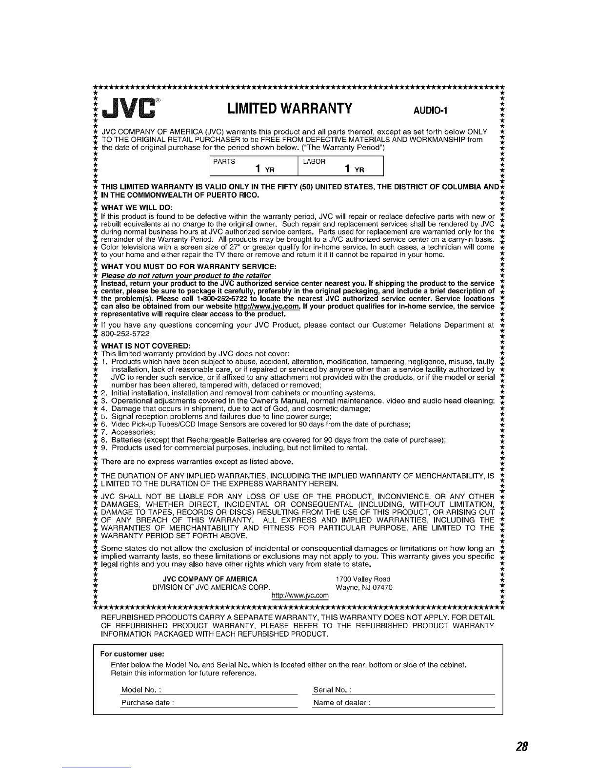 • JVC COMPANY OF AMERICA (JVC) warrants this product and all parts thereof, except as set forth below ONLY *