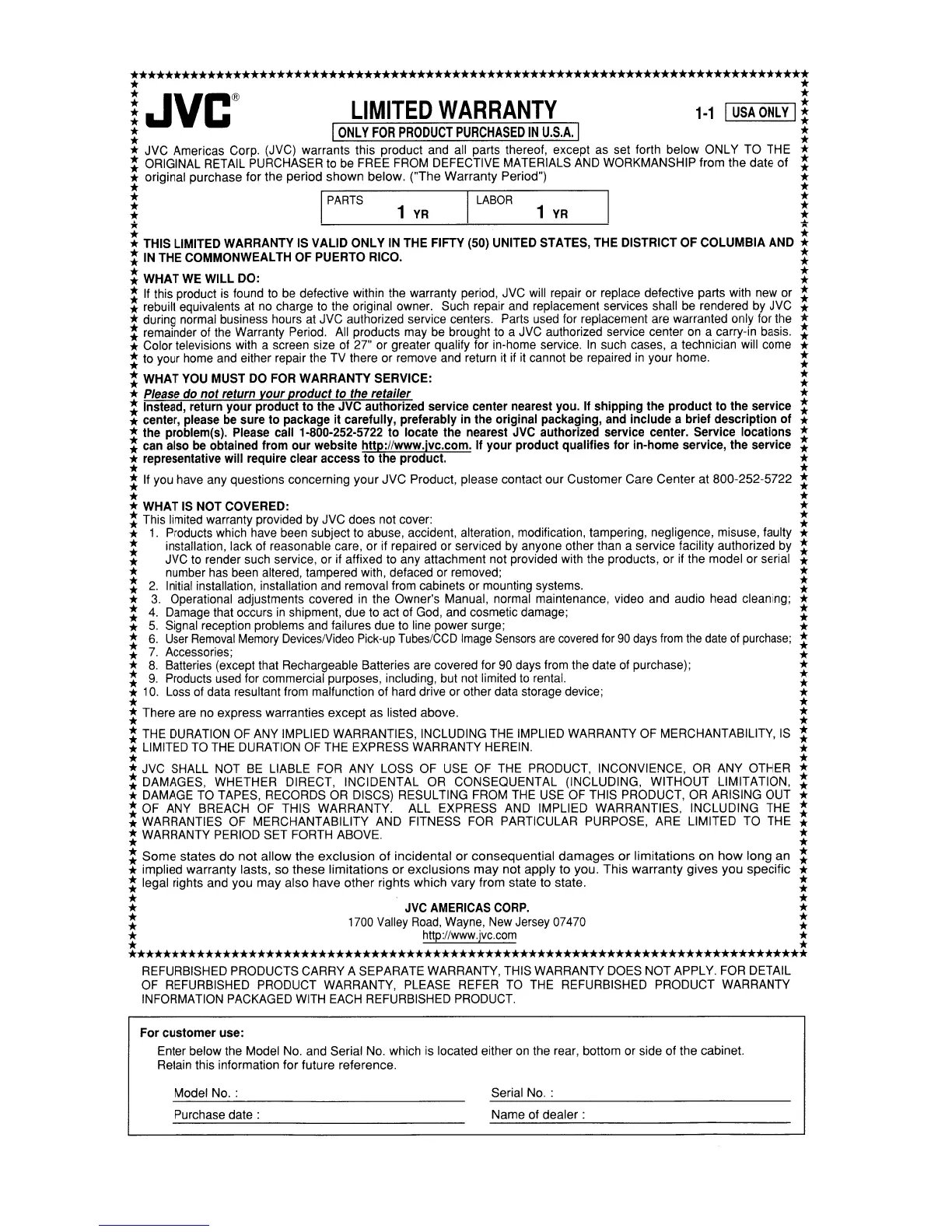 *rebuilt equivalents at no charge to the original owner. Such repair and replacement services shall be rendered by JVC *