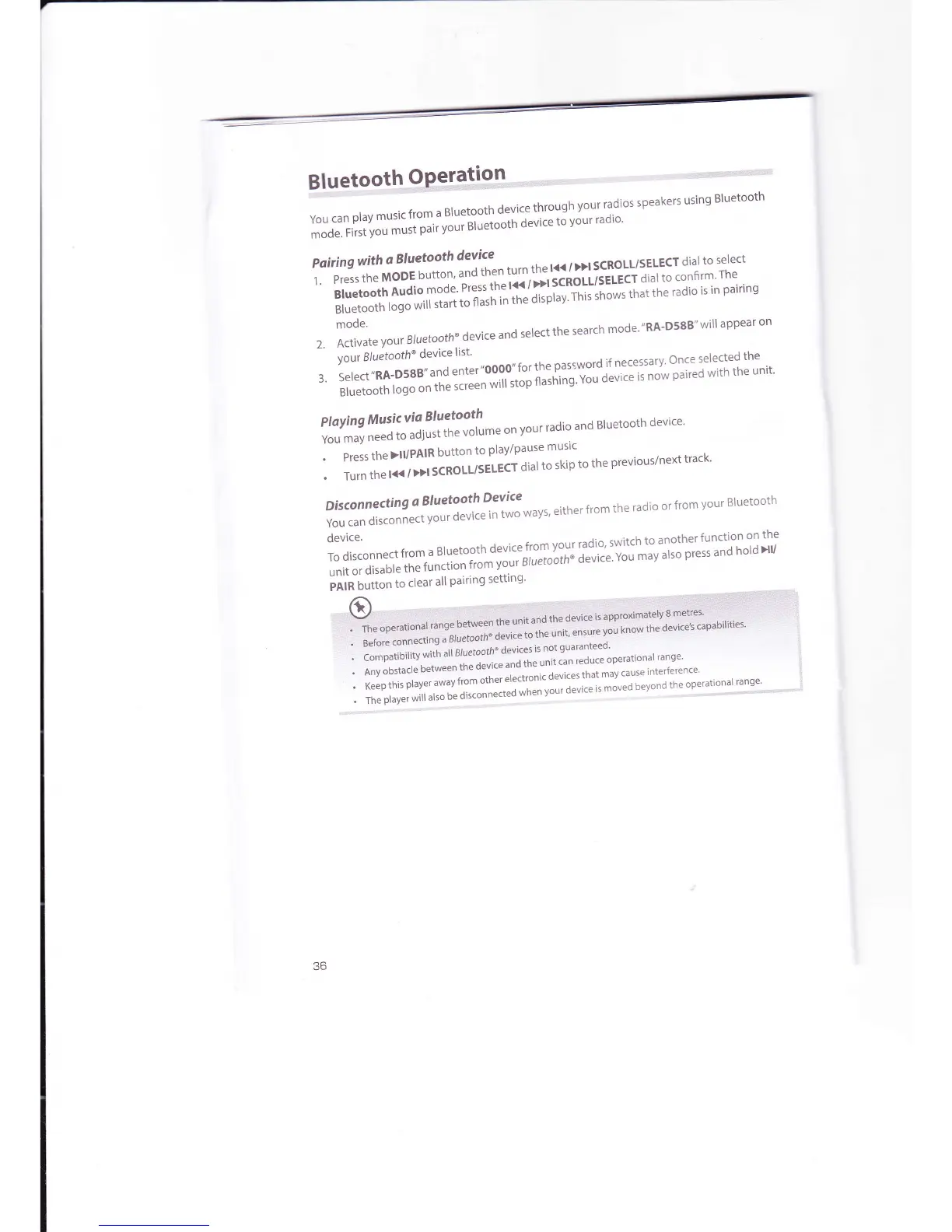 JVC RA-D58B - Bluetooth Operation; Pairing with a Bluetooth Device; Playing Music via Bluetooth; Disconnecting a Bluetooth Device