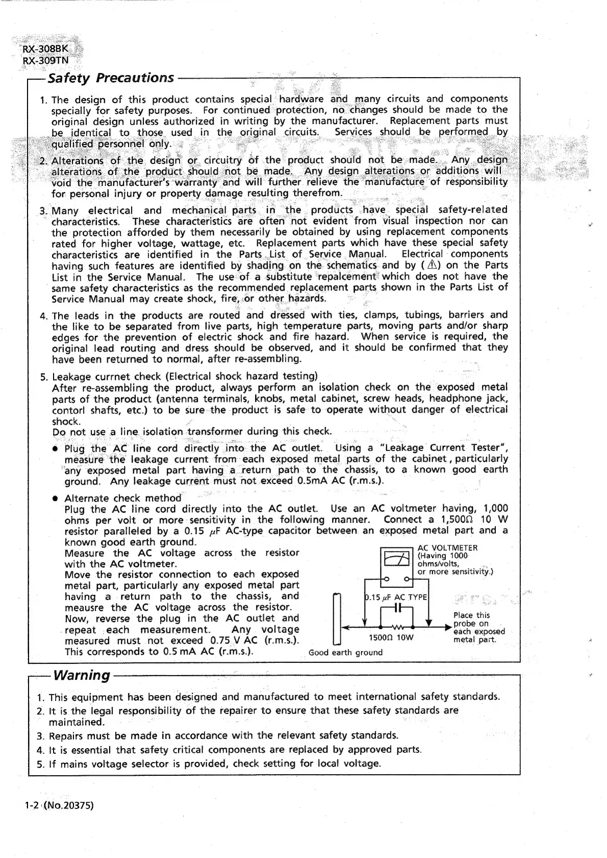 JVC RX-309TN - Safety Precautions; General Safety Guidelines; Electrical Shock Hazard Testing; Critical Component and Repair Warnings