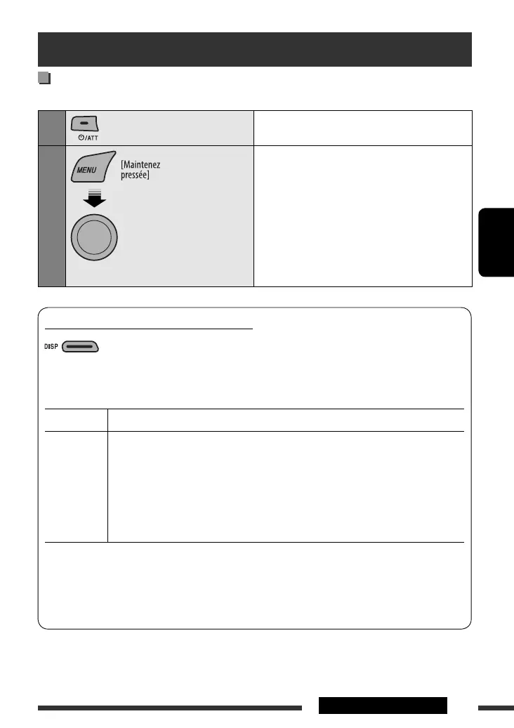 Quand l’appareil est hors tension: L’heure actuelle de l’horloge est affichée si “CLOCK DISP” est réglé sur