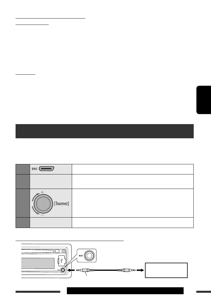 Préparation: Assurez-vous que “AUX ON” est choisi pour le réglage “SRC SELECT” = “AUX IN”, voir page