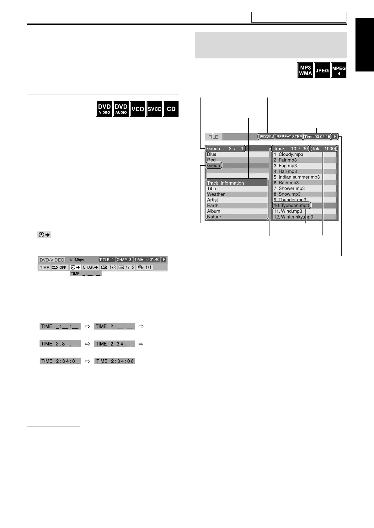 • Du kan ange tiden i timmar/minuter/sekunder för DVD VIDEO/DVD