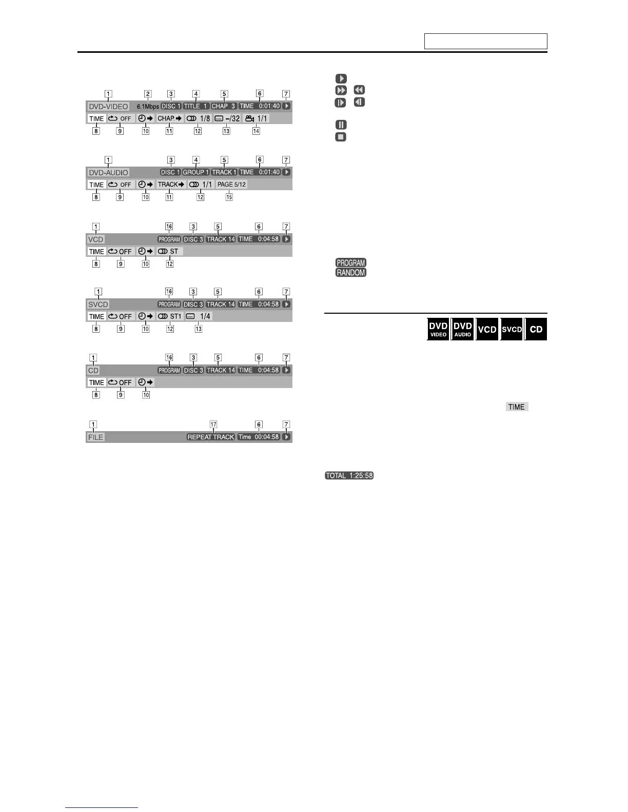 • TIME: Elapsed playing time of current chapter/track