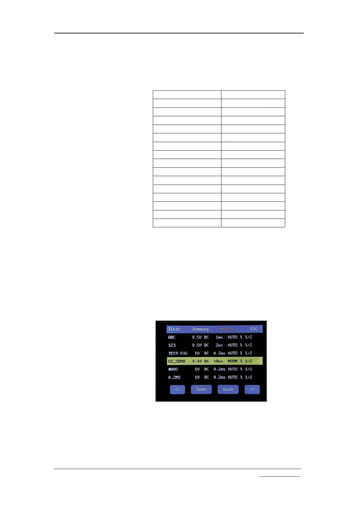 saved to or recalled from. The selected row will be highlighted.