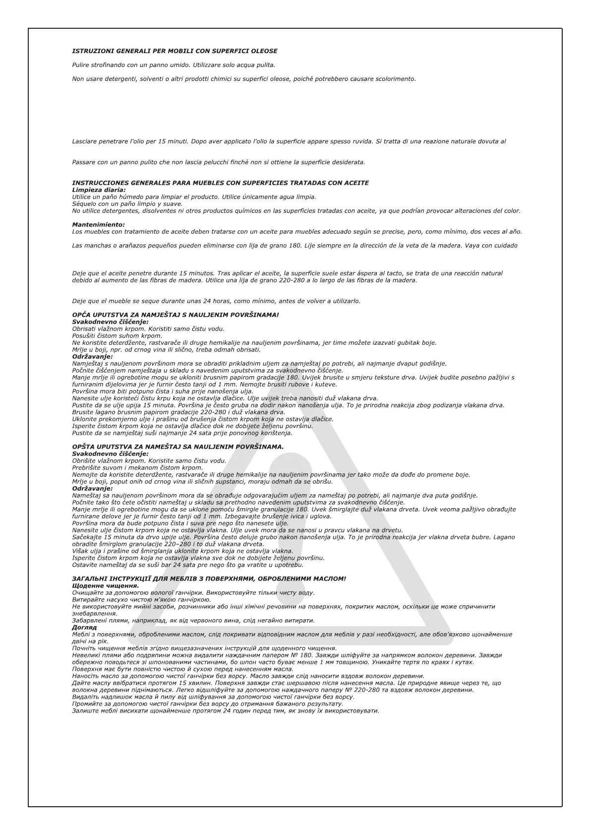 I mobili con superfici oleose devono essere trattati con un olio per mobili apposito secondo necessità, ma comunque almeno due volte l'anno.