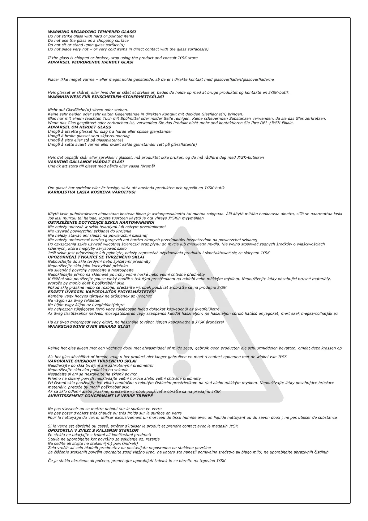 Glasset må udelukkende rengøres med en fugtig klud med opvaskemiddel eller blød sæbe, og der må ikke anvendes præparater, der indeholder