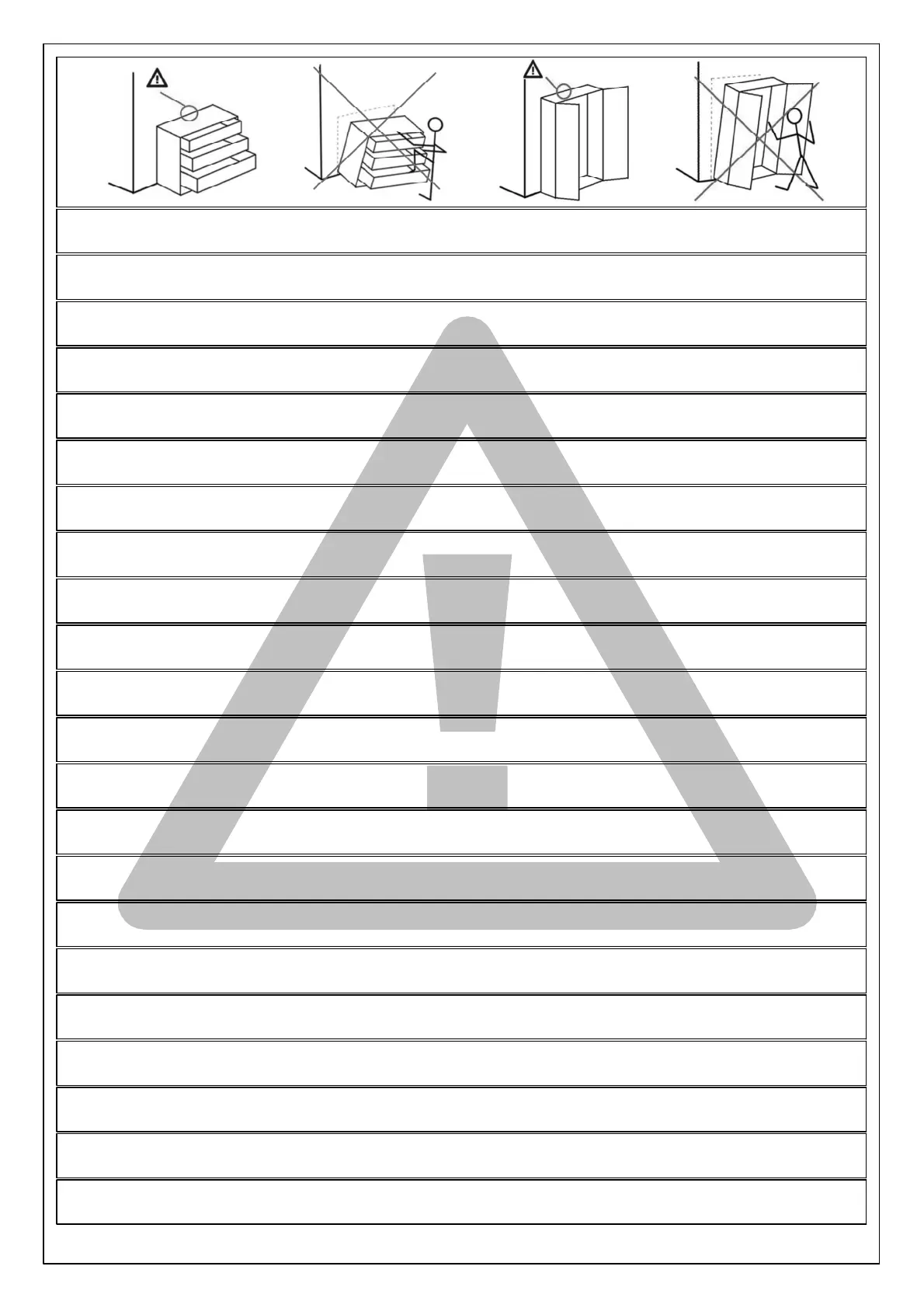 Devrilip düşme sonucu ortaya çıkabilecek ölümcül yaralanmaları önlemek üzere bu ürün, devrilmeye karşı koruyucu destekleriyle birlikte duvara kalıcı olacak şekilde