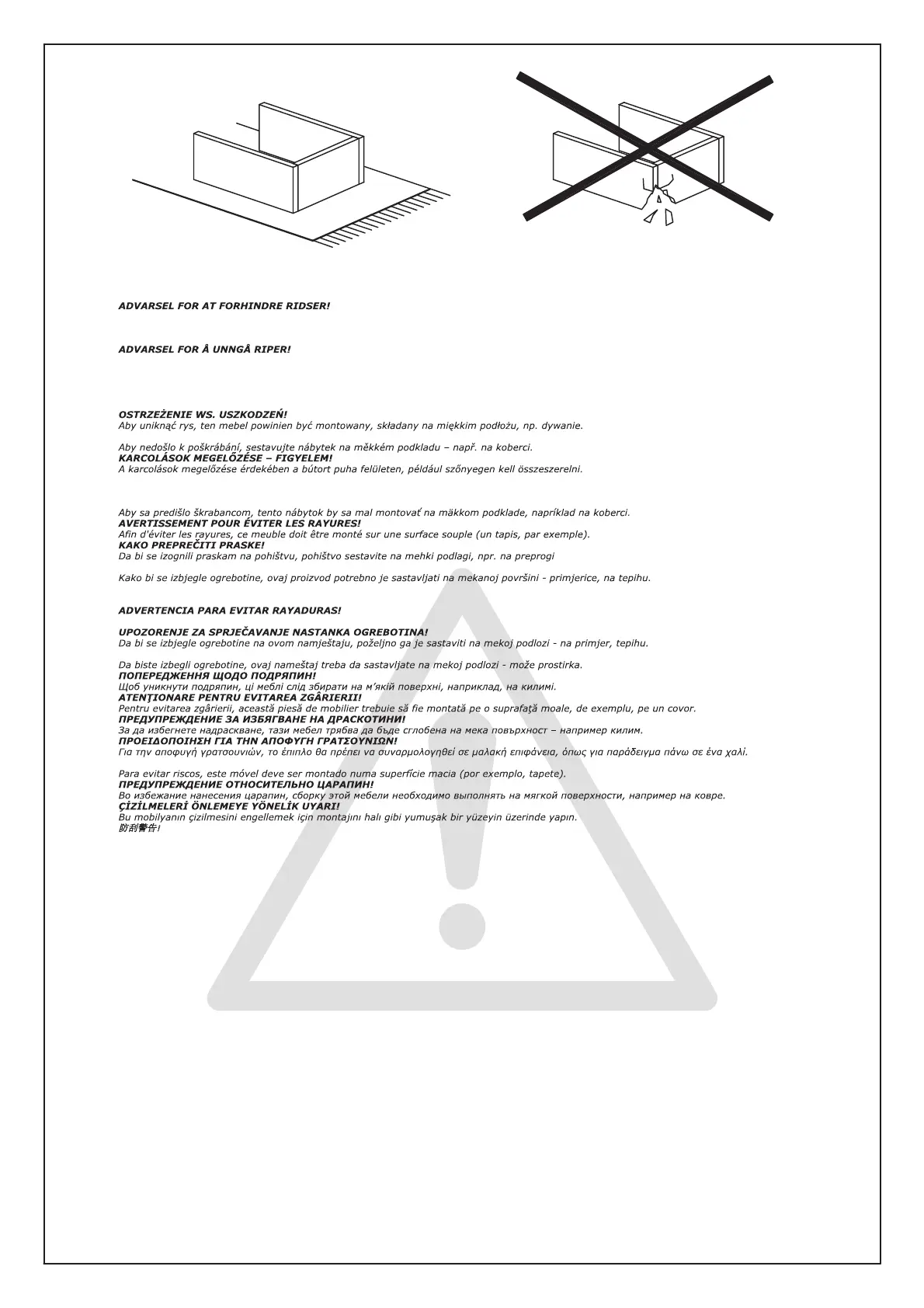 For at forhindre ridser skal dette møbel samles på et blødt underlag, f.eks. et tæppe.