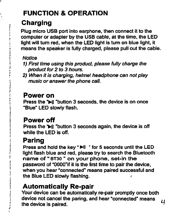 JZAQ BT30 - Core Operations; Charging and Power Management; Bluetooth Pairing and Re-pairing