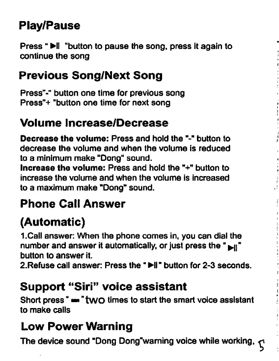 JZAQ BT30 - Functional Controls; Music Playback and Volume; Call Management; Voice Assistant and Warnings