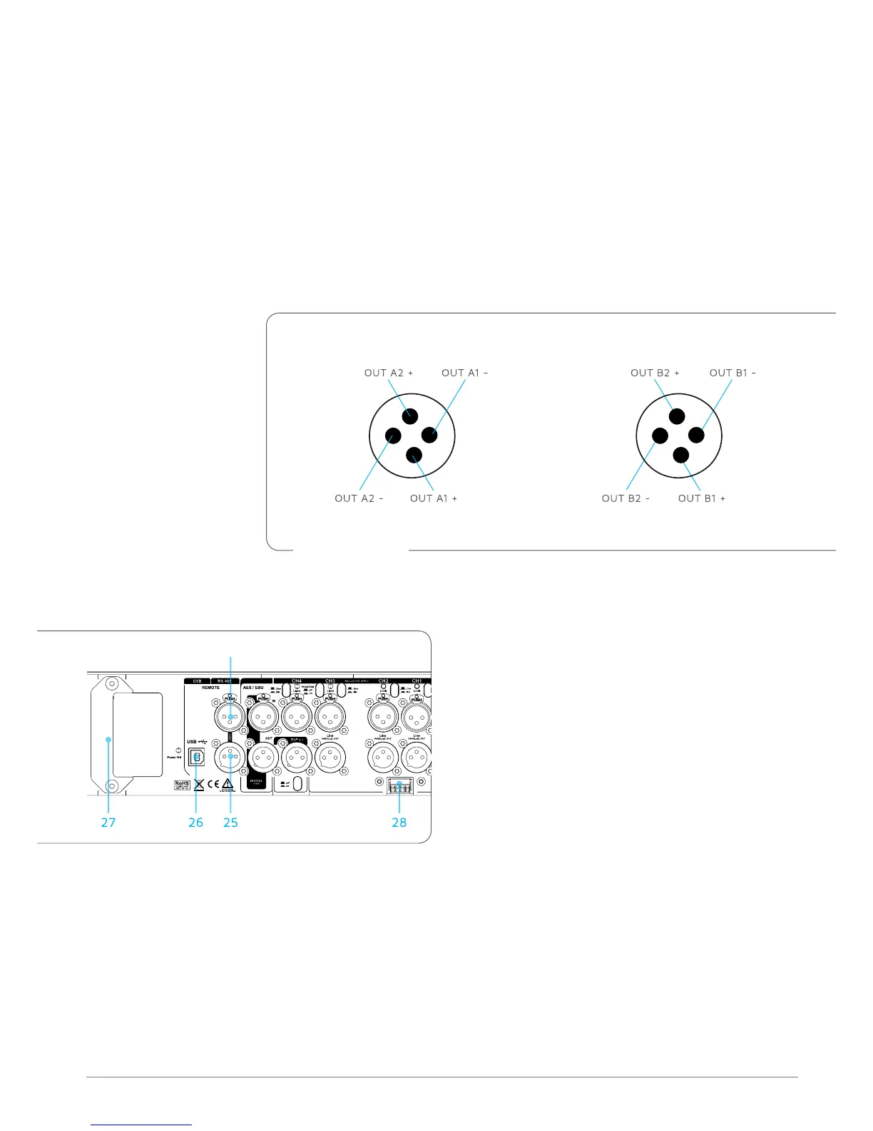 23. POWER OUT B. Speakon output to power passive speakers. 1+/1- provides OUT B1, 2+/2- provides OUT B2.