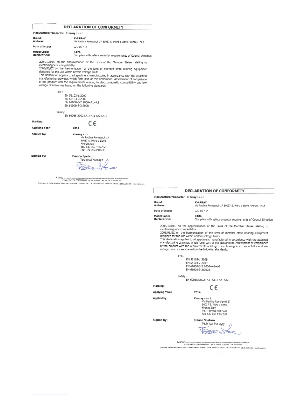 The contents of this manual are furnished for informational purposes only. K-array s.u.r.l. assumes no responsibility for any errors or inaccuracies that may appear