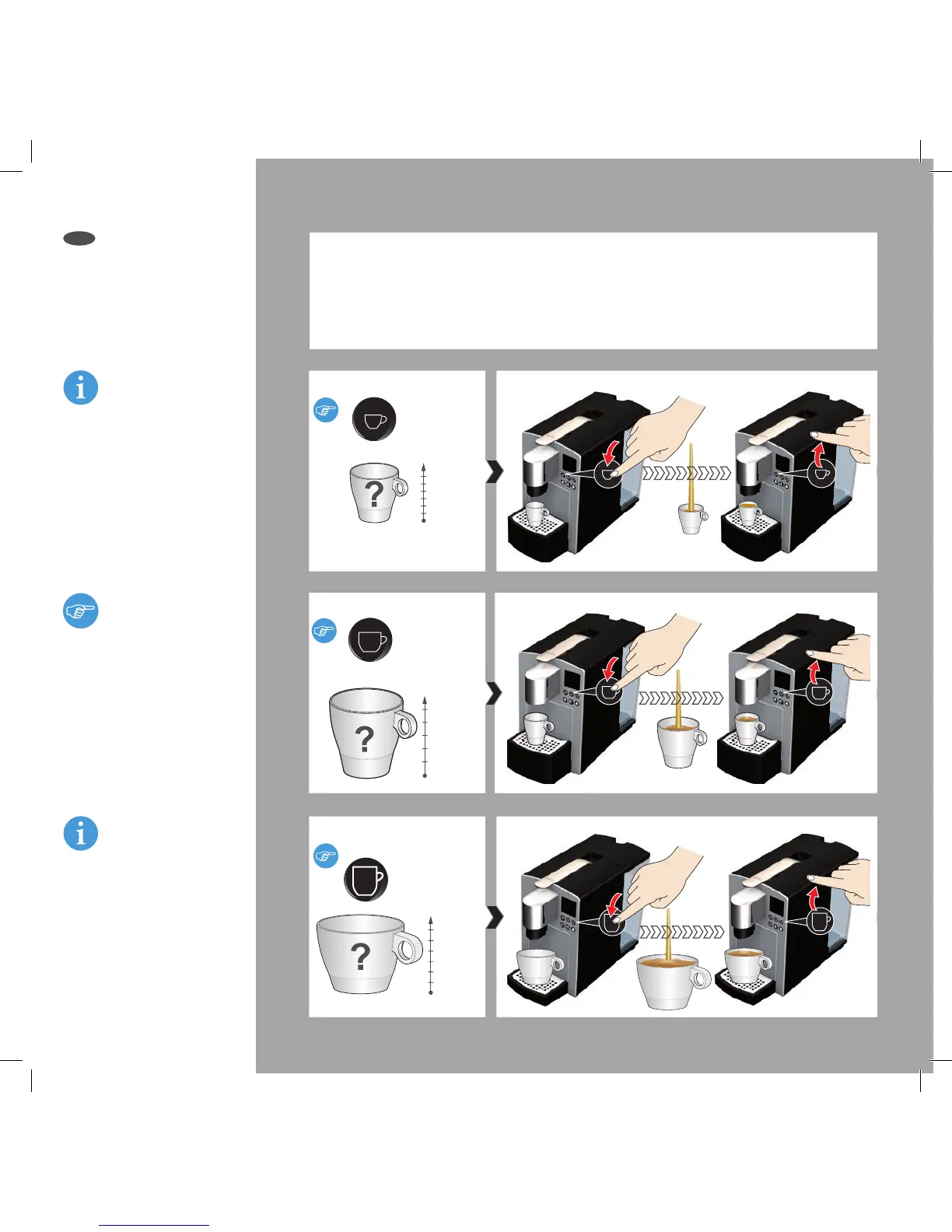 hold down the "Small cup", "Large cup" or "Extra large cup" button until the liquid reaches