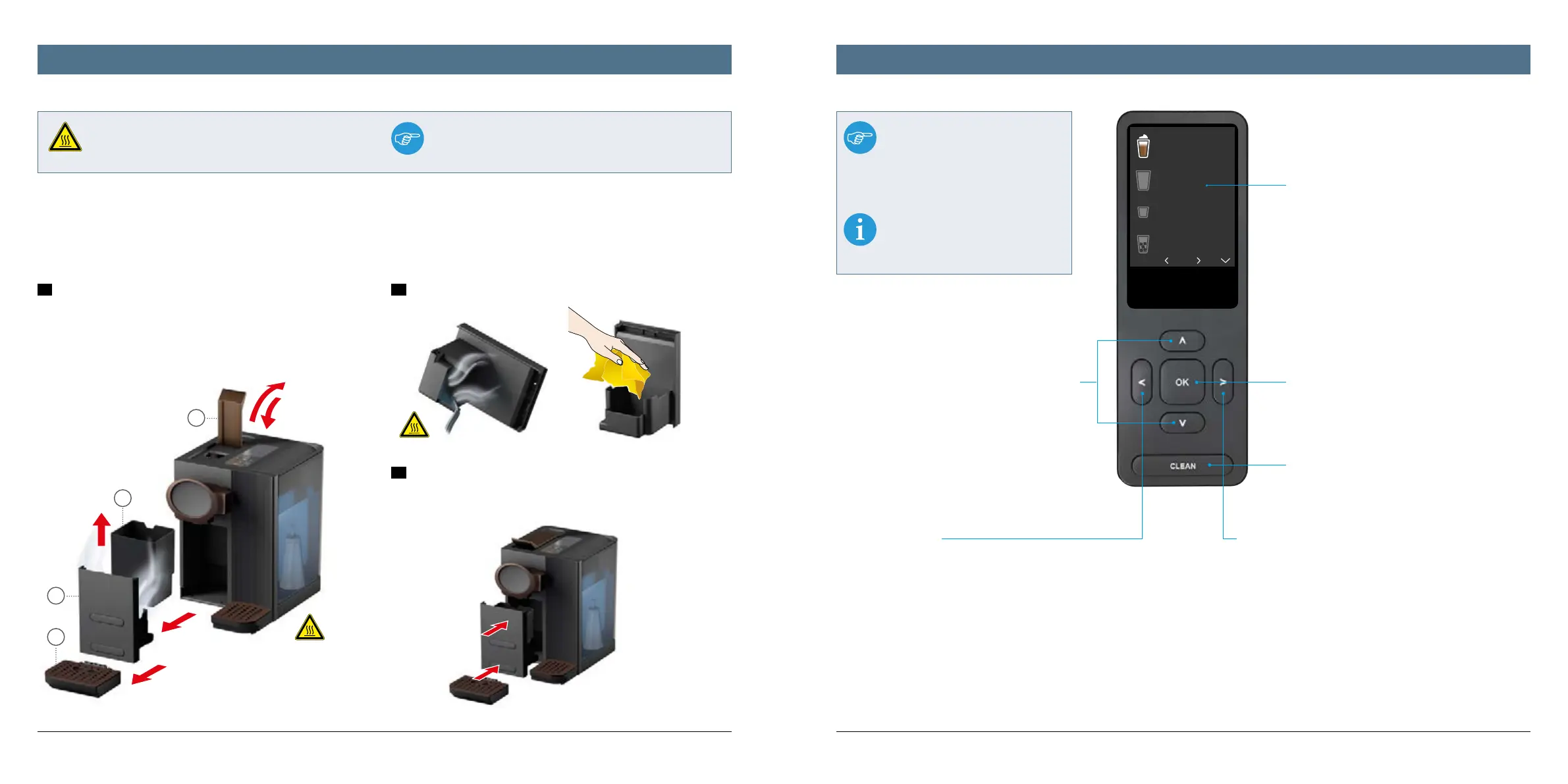 preparation of all beverages containing milk, the activation of the CLEAN button, rinsing and cleaning the milk and coee system as well as purging the system
