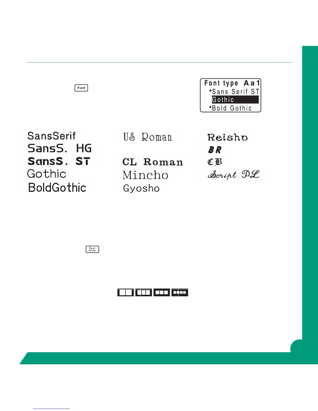 Press the Text Size key repeatedly until the font size you want appears. Watch the blocks for graphic