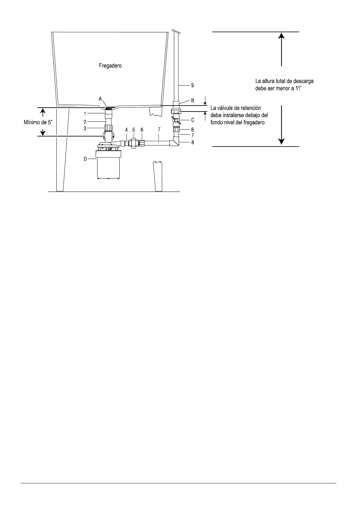 AVISO: La altura vertical de la válvula de retención a la salida del tubo debe ser de al menos 6.5 pies de anular la fuga