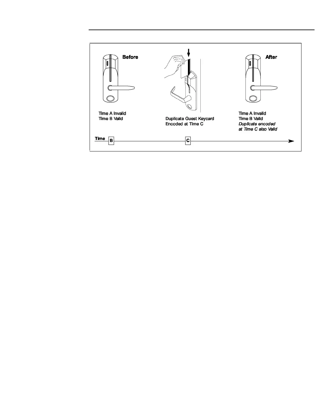 Figure 4.5.3: Duplicate keycards made after the currently valid keycard (time B) are accepted without invalidating