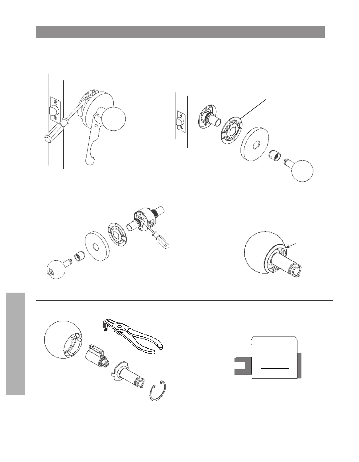 3. Depress outside knob retainer; remove outside knob. 4. Remove knob cap if present.