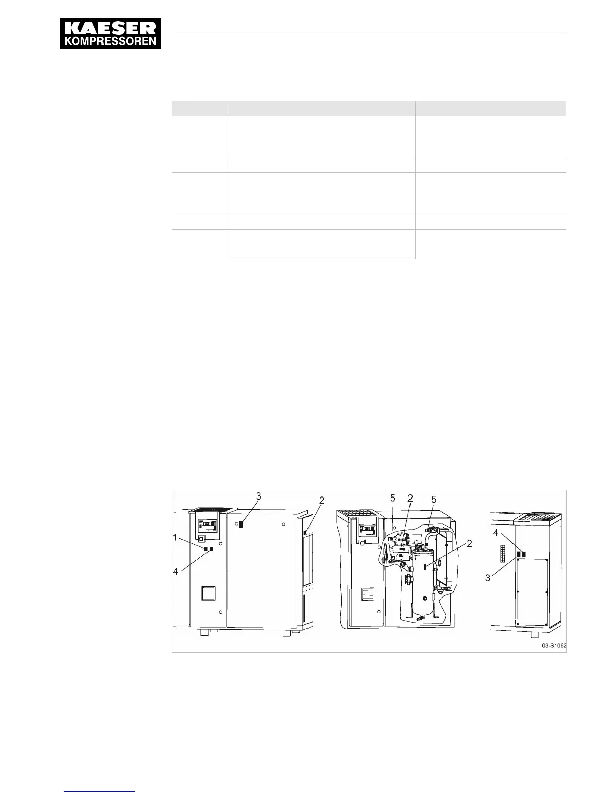The diagram shows the positions of safety signs on the machine. The table lists the various safety