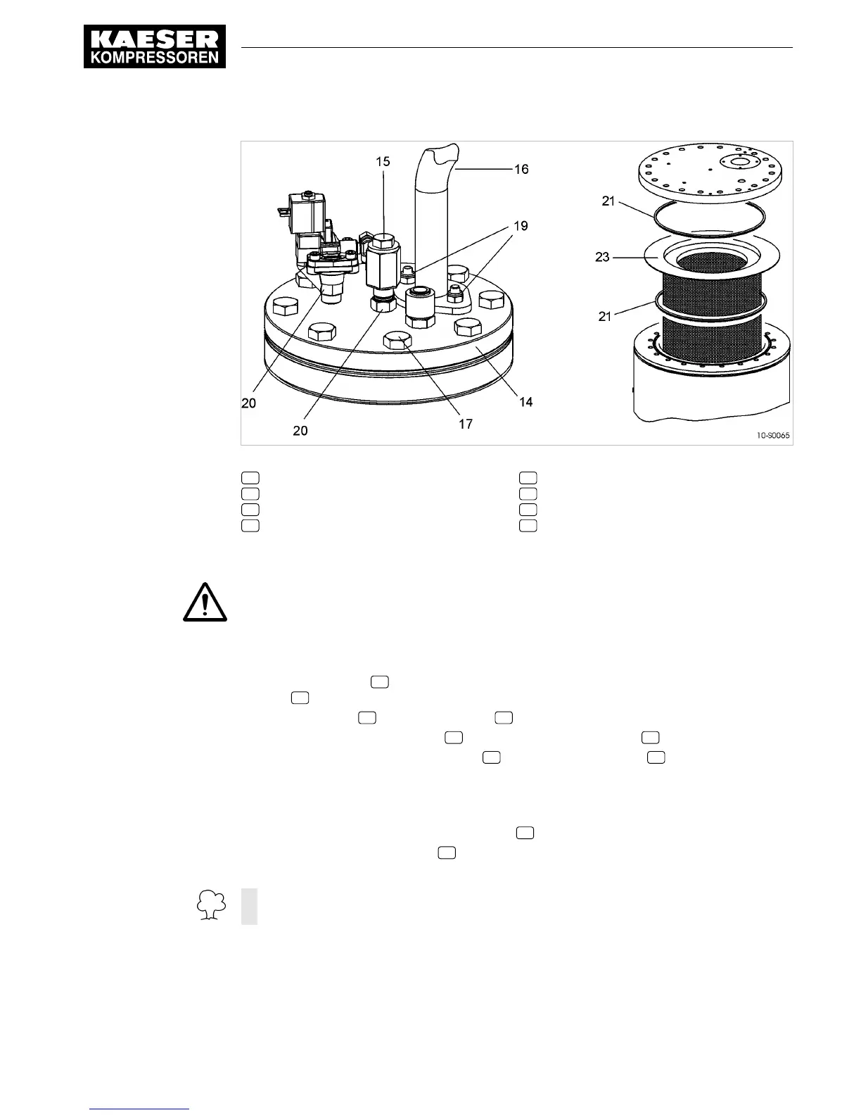 5. Take out the old oil separator cartridge 23 together with the gaskets 21 and dispose of ac‐