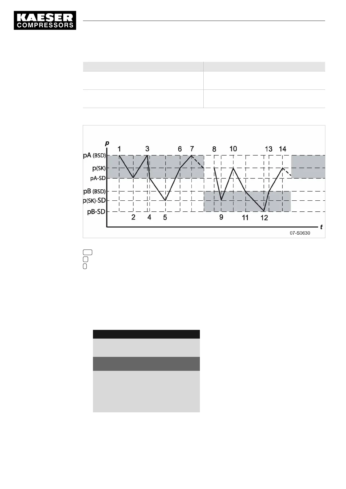 Time period t1–t7: high compressed air demand Time period t8–t14: low compressed air demand