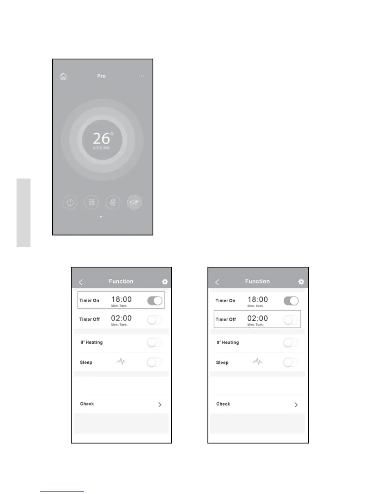 Including: Timer on, Timer off, 8OC Heat, Sleep, Check.