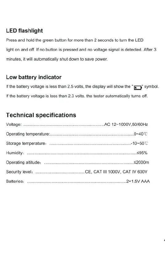 Kaiweets HT106B - Device Features and Specifications; LED Flashlight; Low Battery Indicator; Technical Specifications