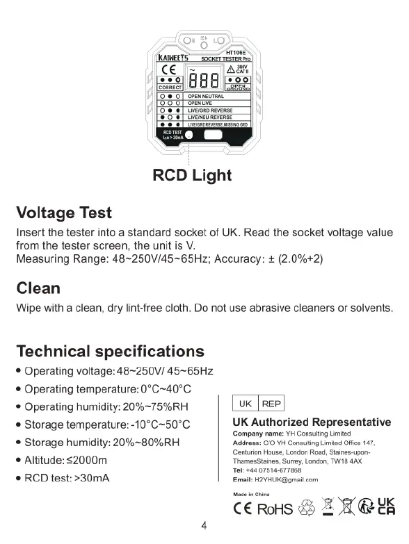 Kaiweets HT106E - Voltage and Maintenance; Voltage Test Procedure; Cleaning Instructions; Technical Specifications