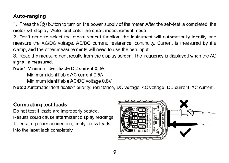 Kaiweets KC602 - Measurement Modes; Auto-ranging Functionality; Test Lead Connection Guide