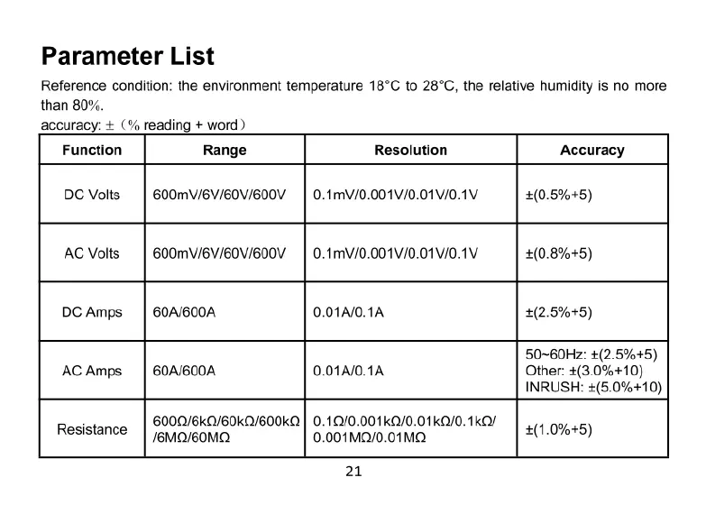 Kaiweets KC602 - Parameter List; Measurement Parameters and Accuracy
