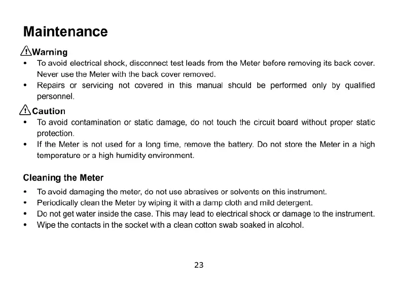 Kaiweets KC602 - Maintenance and Cleaning; Safety Warnings and Precautions; Meter Cleaning Instructions