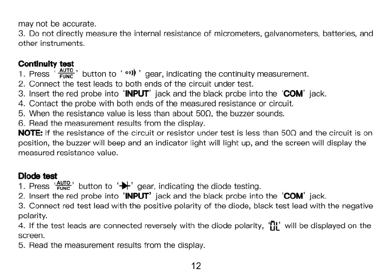 Kaiweets KM601s - Specialized Measurements; Continuity and Diode Test Procedures