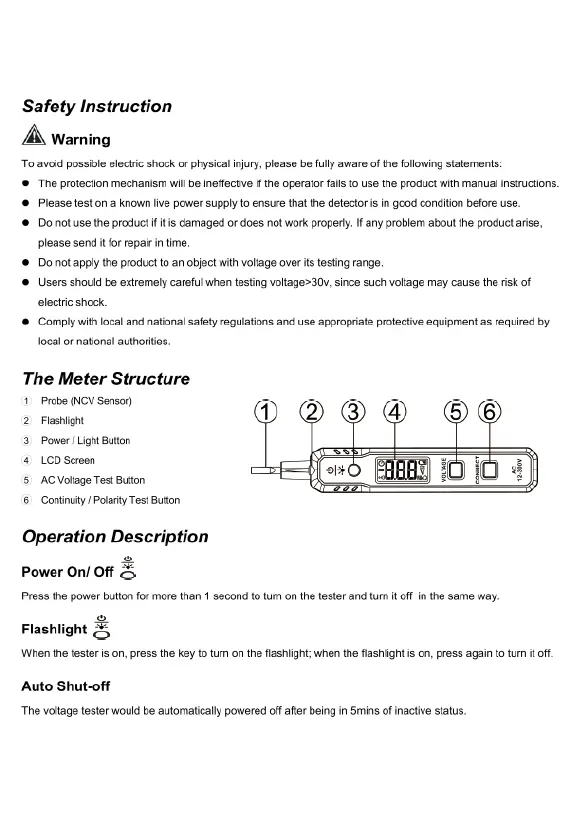 Kaiweets VT500 - Safety Instruction; General Safety Warnings; Meter Overview and Operation; Meter Structure and Components