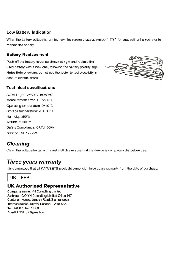 Kaiweets VT500 - Maintenance, Specifications, and Support; Battery Management and Cleaning; Technical Specifications; Warranty and Authorized Representative