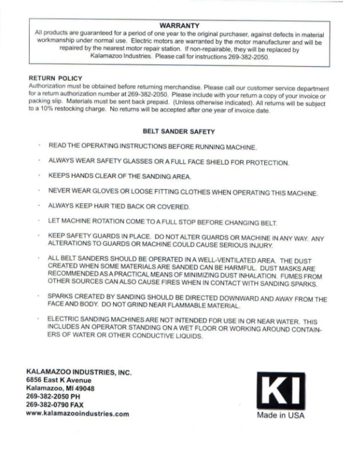 Kalamazoo 2FSM - Warranty and Return Policy; Product Warranty and Returns; Belt Sander Safety Guidelines; Personal Safety Precautions